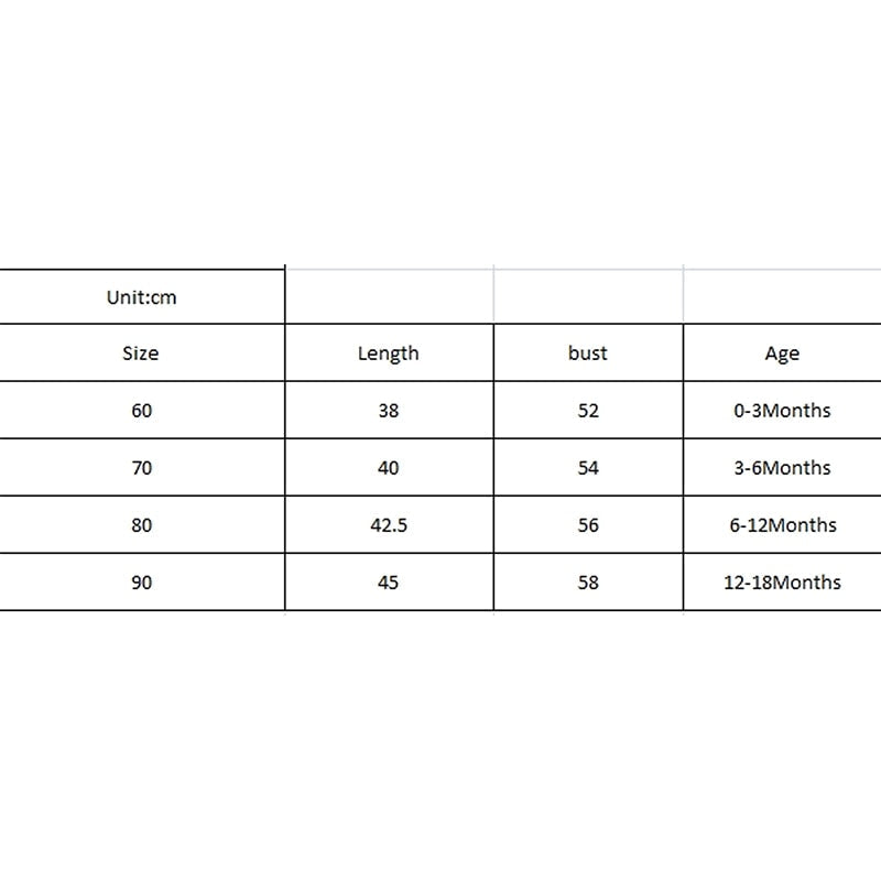 70 Recommended Age: 3-6 Months Tops Length: 40 / 15.75 Bust: 54 / 21.26